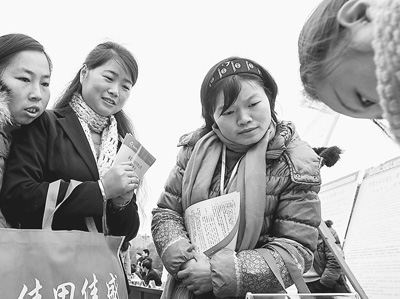 《劳动合同法》修正案公布后,求职者对规范用工更有信心。图为近日在湖北麻城市举行的2013年春风行动系列招聘活动中,几名年轻人在一家企业的招聘台前咨询。新华社记者 程 敏摄
